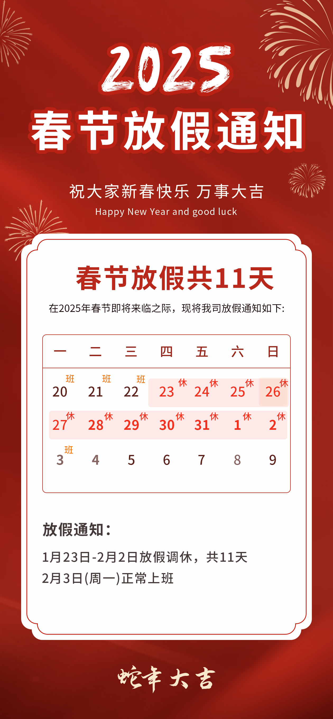 為了讓公司員工過一個歡樂祥和的春節(jié),將對春節(jié)假日提前和延長,現(xiàn)將公司春節(jié)放假時間通知如下:2025年1月23日(農(nóng)歷臘月二十四)~2025年2月2日(農(nóng)歷正月初五)(共計11天),2月3日(農(nóng)歷正月初六)正式上班。